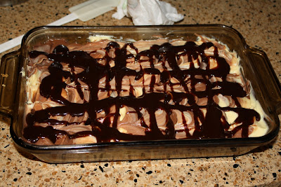Mix the vanilla pudding with 1/2 cup milk, 1 block cream cheese, and 2 tbsp. powdered sugar. Do the same for the chocolate pudding. Crunch your graham crackers up really fine. If you have a food processor, it would be great for this, if not (like me), a plastic bag works fine. Melt butter and add to crackers. Mush the cracker mixture into a pan. Mush is definately a word.